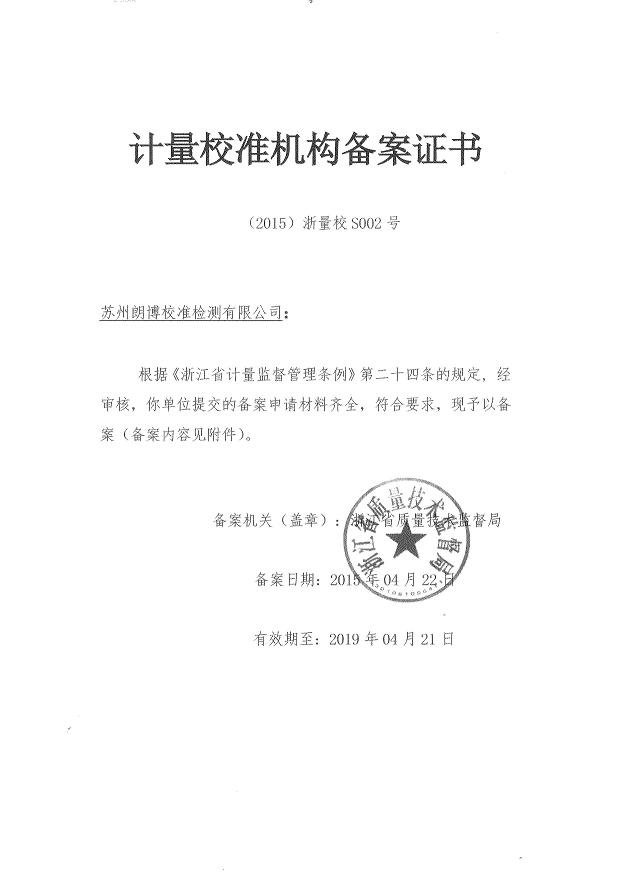 我司已通過浙江省計量校準機構備案有效期至2019年4月2日。朗博校準檢測有限公司(簡稱朗博實驗室)是...