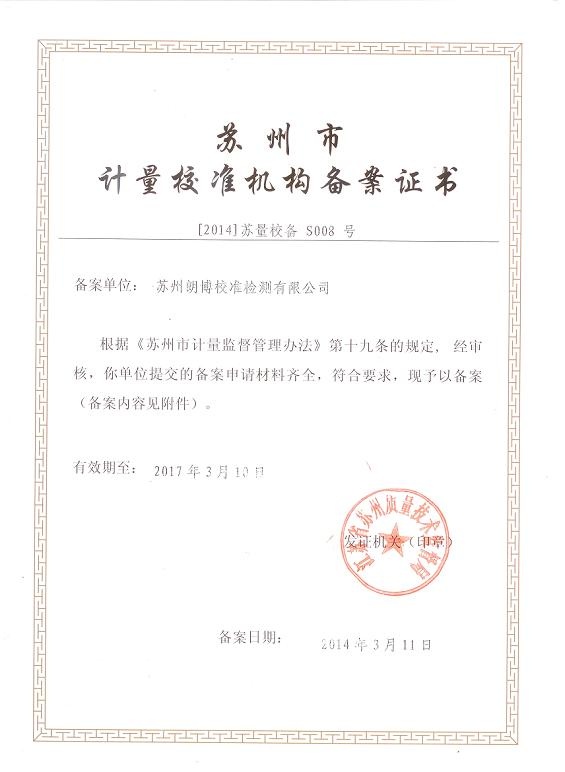 蘇州市計量校準機構備案證書